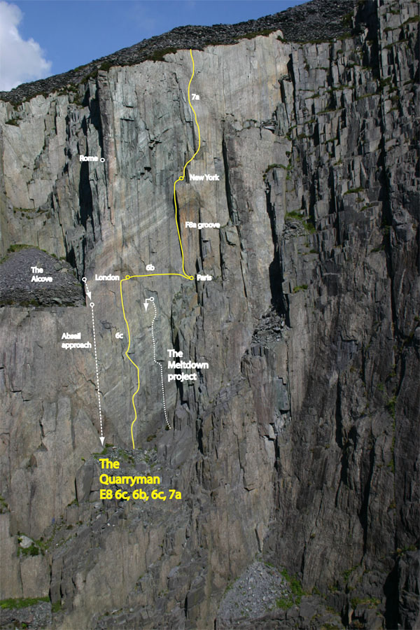 Si je vous dis « une grande voie de 100 m au max, 4 longueurs dans une carrière d’ardoise en Pays de Galle, cotée E8 7a… ça ne vous avance pas plus, n’est-ce pas ?