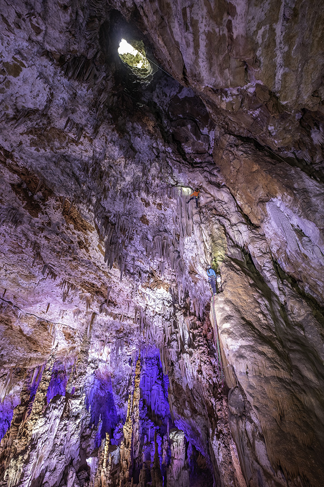 Il nous mit en relation avec l’équipe de la Grotte de la Salamandre, à 30 km de chez nous dans le Gard, et Pierre Bevengut nous montra l’après midi même les possibilités. Hors de question de grimper dans les draperies les plus fragiles, mais en choisissant bien notre ligne, nous pourrions nous frayer un chemin jusqu’en haut de l’Aven, jusqu’à la surface!