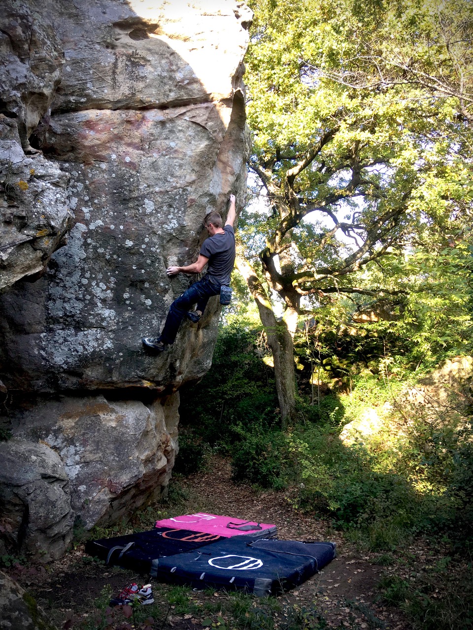 Je le connais comme ma poche et pourtant je m’y perds encore (comme quoi on peut être grimpeur et ne pas savoir s’orienter dans sa maison), et la perle quand on y fait un tour (enfin d’habitude), c’est justement de trouver un petit bout de caillou, quelques prises qu’on n’avait pas repérés avant. Bien sûr ce sera un bloc en éliminantes, mais quand on ouvre dans son jardin, on fait avec ce qu’il reste.