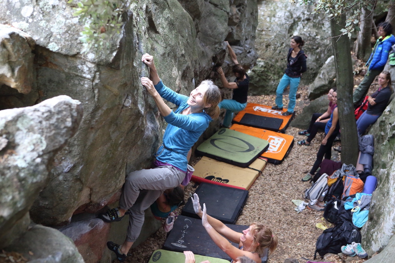 Mais pour ma première journée de grimpe dehors, je ne vise pas bien haut, je n’ai pas vraiment dans l’idée de « croiter », de forcer ou d’hurler; je rêve simplement de refaire mes classiques, de toucher des prises dont je me rappelle : cette arquée formée par une veine de fer, ce plat qui demande un positionnement parfait des doigts. J’ai envie de prendre mon temps, de m’asseoir sur mon pad et de toucher le rocher avant de m’y pendre. J’ai envie de prendre le temps de bien nettoyer mes chaussons avant de les reposer sur le grain de grès. J’espère qu’il y aura juste quelques grimpeurs avec lesquels me réjouir, et j’emmènerai un beau pique nique. Peut-être même une bouteille de champagne. Une ou deux gorgées entre chaque bloc peut-être…