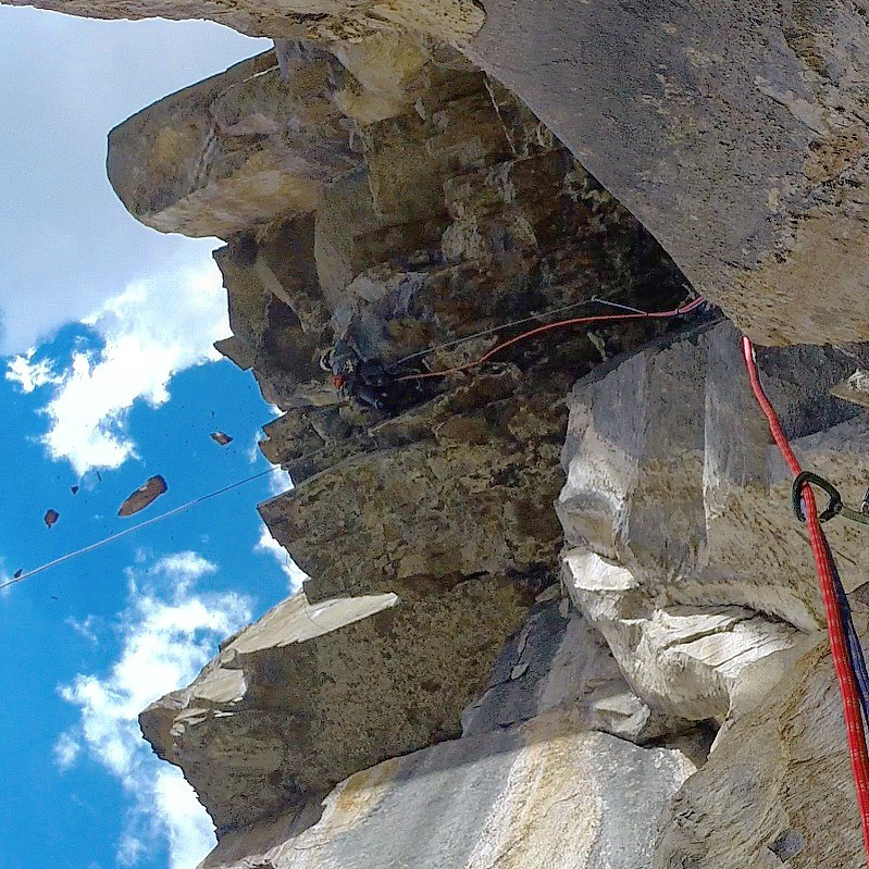 Ce qu’on n’avait pas prévu, c’est ce mikado de blocs en équilibre fragile, toujours déversant. 12 heures de grimpe ou j’ai laissé James partir en premier, c’en était trop pour moi, et où chaque mouvement devait se faire sans changement brusque de poids, sur la pointe des pieds, pour ne pas déranger le rocher ! Une inquiétude constante : là, si je tombe je risque de couper la corde. Là, si le bloc bascule, je risque de couper la corde. Dans un dévers pareil sans points, impossible de redescendre en cours de route en cas de problème, il faut sortir en haut.