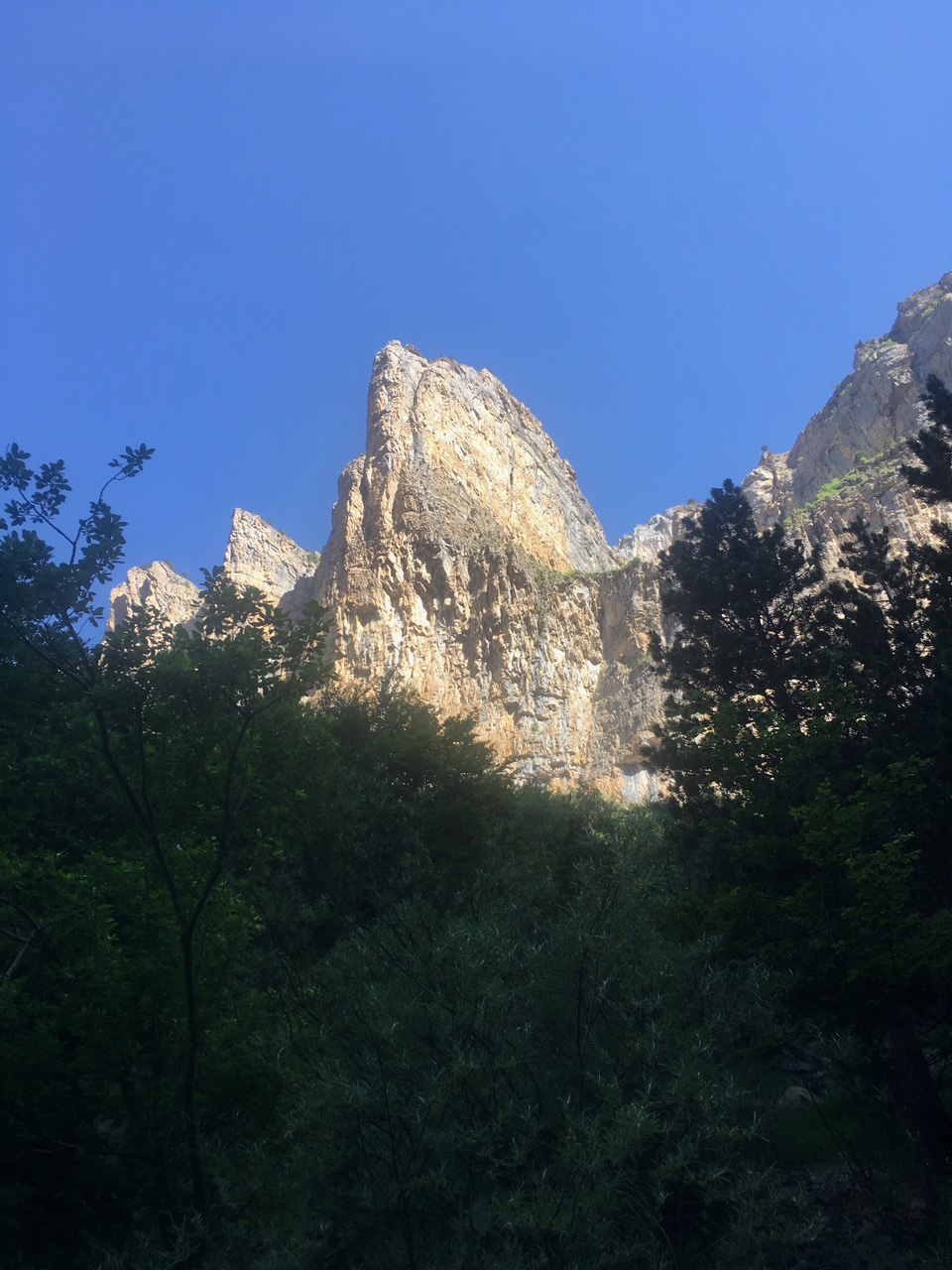 Sur le papier, rien de bien horrible : 400, 8a max avec 5 longueurs dans le 7. On regarde en détail le topo, sans jamais voir de petites croix… hum… une petite croix, c’est un spit… et bien la c’est simple, il n’y en a pas. Escalade en trad, relais en trad, il va falloir se lever tôt pour avaler 400 m de dur dans ce style.